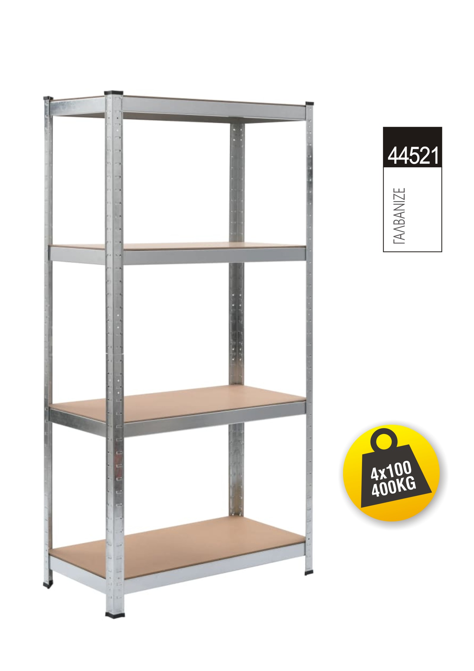Μεταλλική Ραφιέρα χρώμα γαλβανιζέ με 4 ράφια ξύλο MDF και αντοχή 100 kg ανά ράφι. Είναι ιδανική για την οργάνωση και τοποθέτηση διαφόρων αντικειμένων στον χώρο σας. Η συσκευασία περιλαμβάνει κολώνες, κομβοελάσματα, ράφια, οδηγίες συναρμολόγησης.