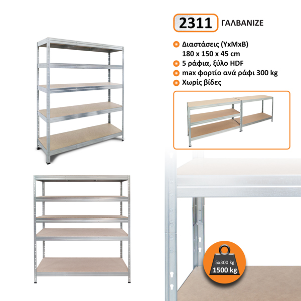 Μεταλλική ραφιέρα τ.Dexion με ξύλο HDF Garage Rivet 180x150x45cm, 5x300kg κωδικός 2311 χρώμα Γαλβανιζέ